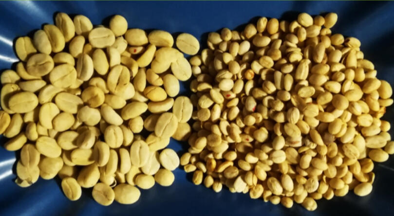This image shows C.arabica in parchment on the left, and C.racemosa in parchment on the left. The tiny bean size is tricky to harvest, process, and roast. In order to hear 1st crack during roast, a stethoscope is recommended